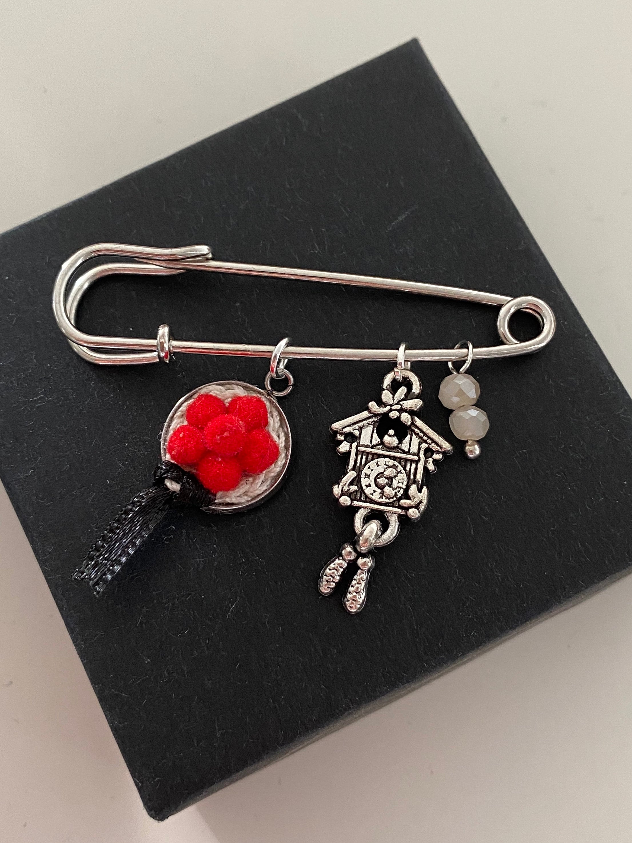 Safety pin (silver) with lovingly handcrafted pom-pom hat (approx. 12 mm), cuckoo clock pendant and pearls.